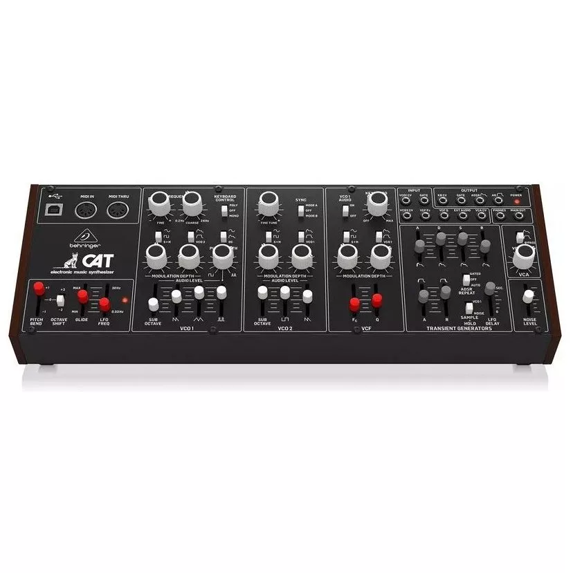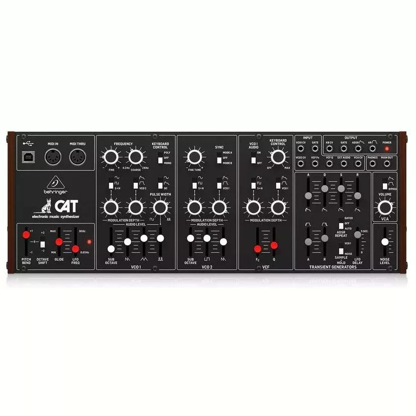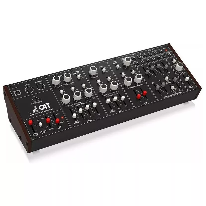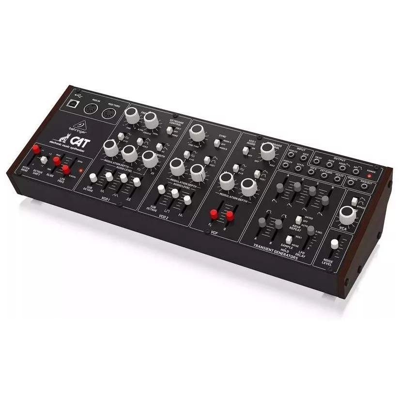 Behringer CAT Synth - ремейк аналогового синтезатора CAT SRM II, но без клавиатуры. Синтезатор оснащен двумя генераторами VCO, первый из которых предлагает 4 смешиваемых формы волны (пилообразную, треугольную, модулированную синусоиду и суб-октавную прямоугольную), а второй имеет пилообразную, прямоугольную и суб-октавную. Для каждого генератора предусмотрен микшер со слайдерами форм волны, что позволяет, смешивая их, настроить желаемый звук. Осцилляторы снабжены двумя аттенюаторами глубины модуляции и могут модулироваться шестью различными источниками.