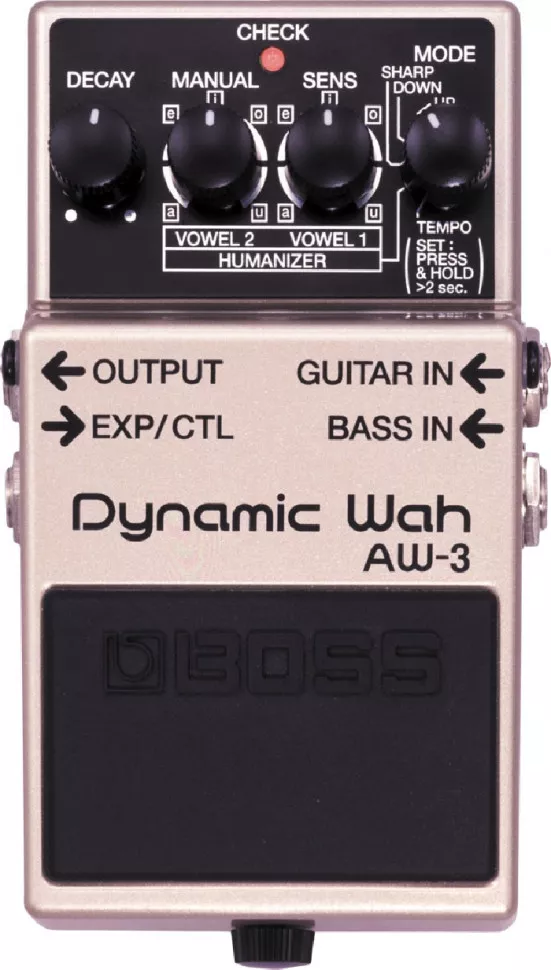 - Новая динамическая Wah-педаль BOSS AW-3 дает гитаристам широкий спектр классических авто-вау (Auto-Wah) и динамических эффектов Wah, кроме того новый Humanizer-эффект может имитировать человеческую речь (гласные). Дополнительный вход Bass на гитарной приставке обеспечивает разнообразные фанковые (funk) звуки для бас-гитаристов, не обижая при этом почитателей электрогитары.