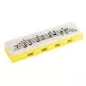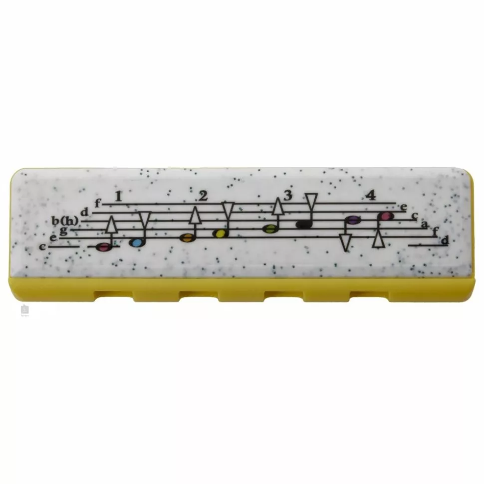 Для самых маленьких харперов в компании Hohner разработали гармошку Hohner M91312 Speedy Yellow/Green. У нее 4 отверстия, а аппликатура проиллюстрирована на верхней части инструмента. Гармоника изготовлена из пластика, благодаря этому она не уязвима для изменения влаги и температуры. В качестве строя был выбран привычный для этого инструмента к мажору (C).