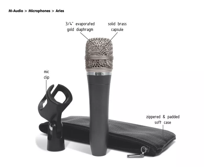 Aries - профессиональный конденсаторный кардиоидный микрофон, специально разработанный для вокалистов для концертных выступлений. Хотя конденсаторные микрофоны обеспечивают лучшую звукопередачу, чем динамические, они обычно используются в студиях из-за своей чувствительности. Теперь разработанная M-Audio оригинальная конструкция подвеса мембраны позволяет Aries принести студийное качество прямо на сцену. Кардиоидный капсуль с 6-микронной позолоченной мембраной и всторенным поп-фильтром предохраняют микрофон от изличних шумов и обеспечивают минимальную обратную связь даже при высоком звуковом давлении. В таких условиях не стоит выбирать динамический микрофон для концертных выступлений, если можно приобрести конденсаторный. Идеально-ровная АЧХ во всём диапозоне +/- 1дБ.