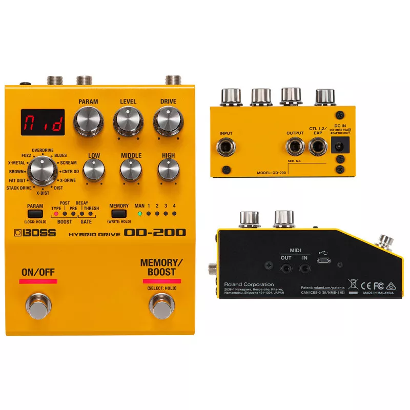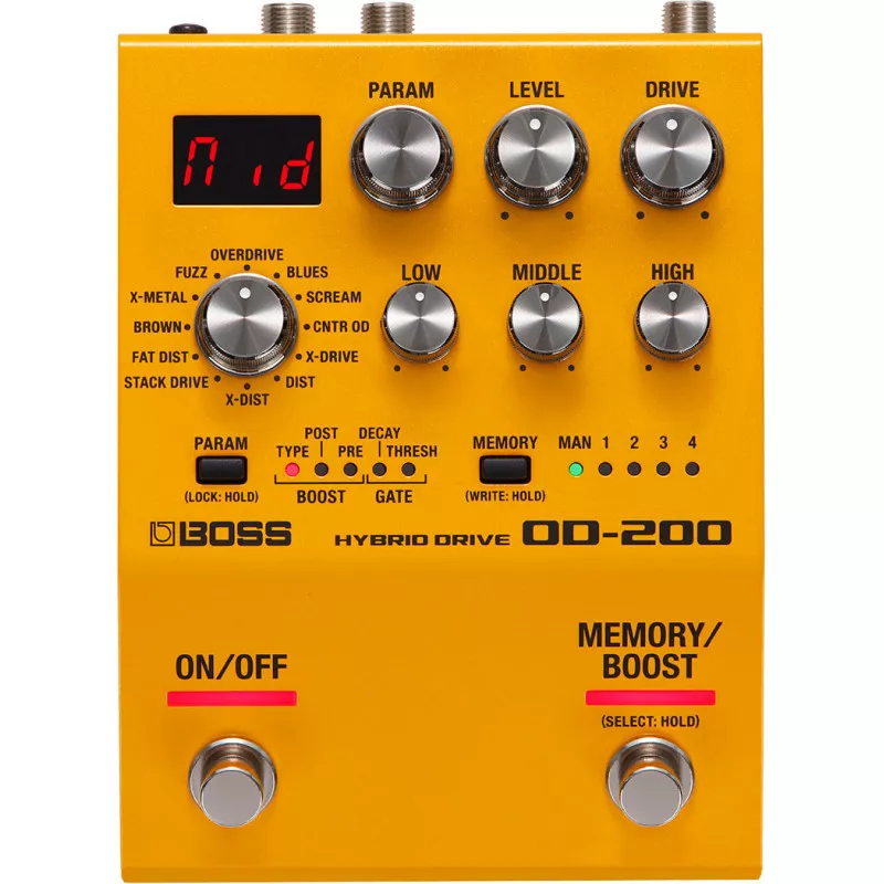 Boss OD-200 Hybrid Overdrive - гибридная моно педаль эффектов овердрайв и дисторшн нового поколения. В цифровой части педали применяется АЦ/ЦА конвертация с разрешением 32-бит и частотой дискретизации 96 кГц, что обеспечивает студийное качество звучания. Простое и интуитивно понятное управление делает настройку эффектов быстрой и легкой, а четыре ячейки памяти позволяют сохранить понравившиеся настройки для мгновенного применения. Два многофункциональных футсвича помогают осуществлять управление педалью без помощи рук.