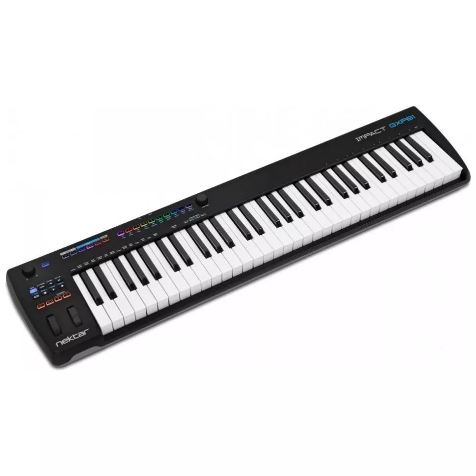 Nektar Impact GXP 61 обладает полноразмерной полувзвешенной механикой клавиш с поддержкой aftertouch. Имеется 5 разных кривых velocity под разную манеру игры и разные тембры. В качестве варианта можно использовать 3 фиксированных уровня. Есть два стандартных колеса, плюс назначаемый на MIDI события потенциометр и поддержка педали/ножных переключателей.
