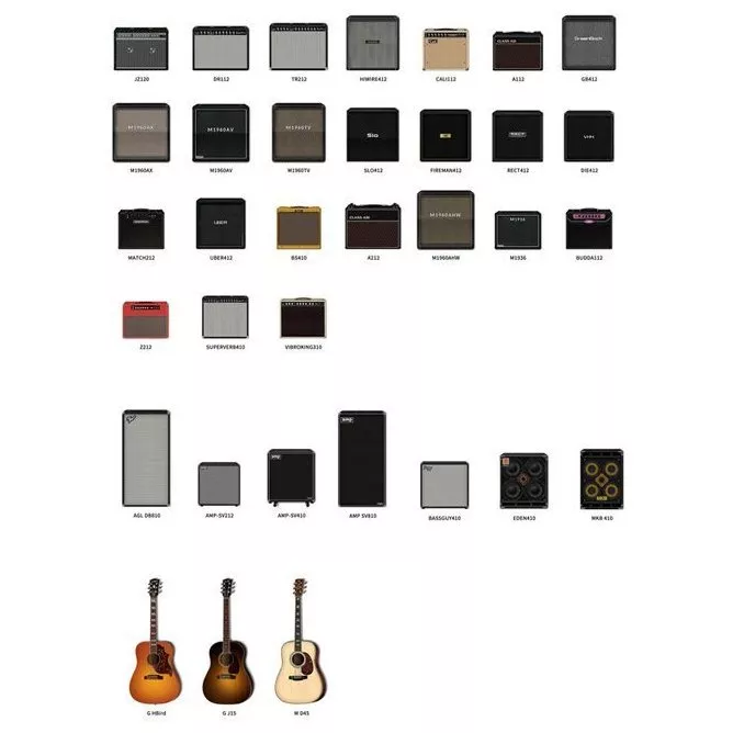 Гитарные кабинеты: JZ120, DR112, TR212, HIWIRE412, CALI 112, A112, GB412, M1960AX, M1960AV, M1960TV, SLO412, FIREMAN 412, RECT 412, DIE412, MATCH212, UBER412, BS410, A212, M1960AHW, M1936, BUDDA112, Z212, SUPERVERB410, VIBROKING310.
