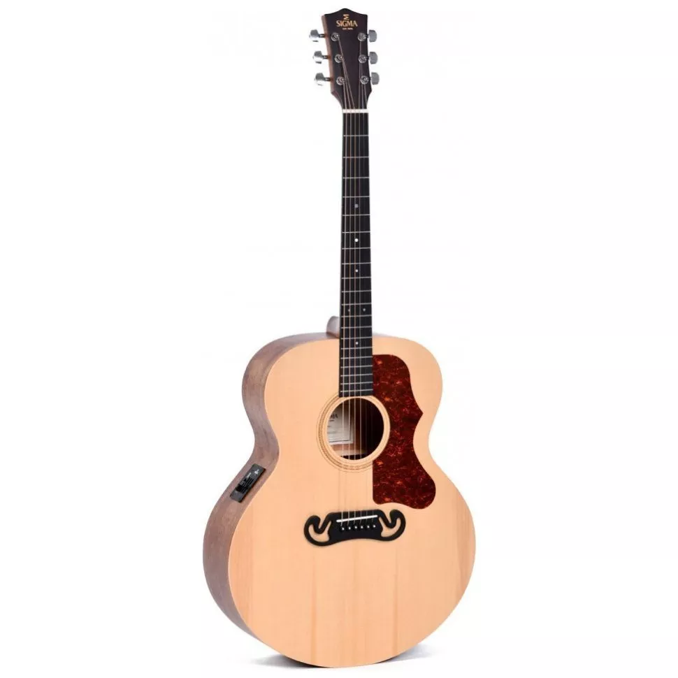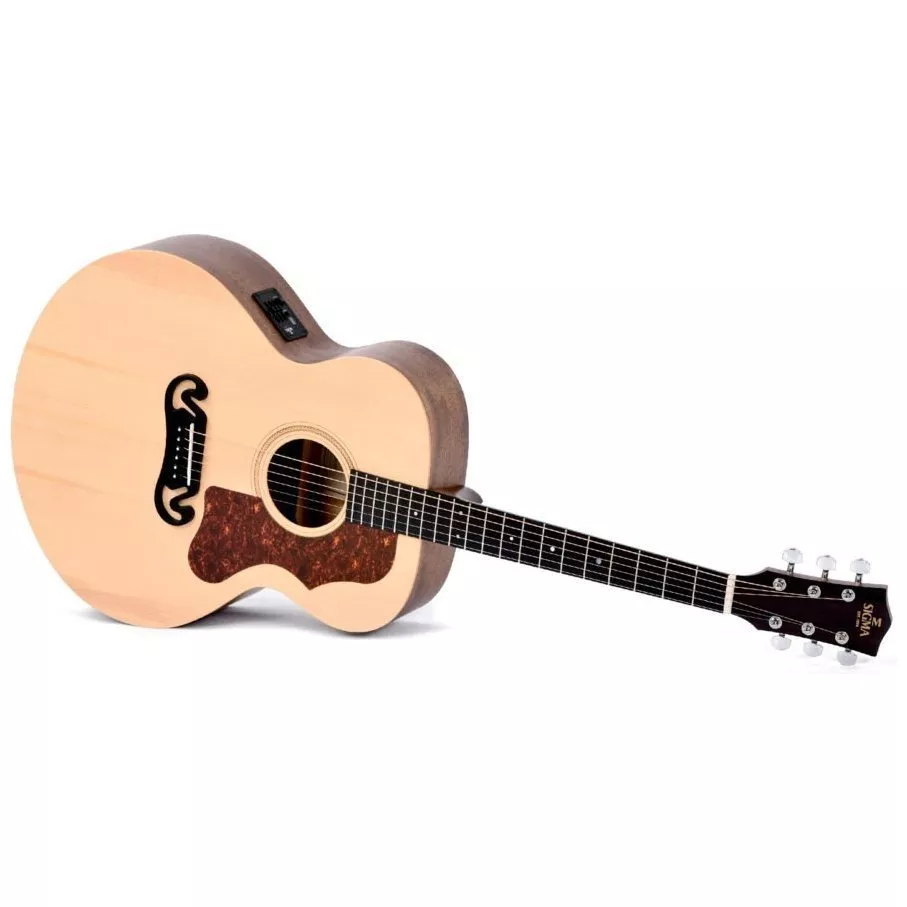 Sigma GJME – предлагает бюджетный вариант электроакустической гитары с корпусом Grand Jumbo и активным преампом Sigma. Инструмент производится из высококачественной древесины, поэтому гитаре присуще теплое, динамическое звучание. Топ акустической гитары изготовлен из цельной ситхинской ели, которую редко можно встретить в инструментах в этом ценовом диапазоне. Одной из главных особенностей акустики GJME – ее большой, объемный корпус Grand Jumbo, предлагающий мощное и открытое звучание. Иногда гитаристы даже шутят об этой форме корпуса, что это инструмент точно не для дома, а для больших живых перфомансов. Также корпус Grand Jumbo обеспечивает акустической гитаре глубокое звучание с объемной нижней серединой и яркими верхами.