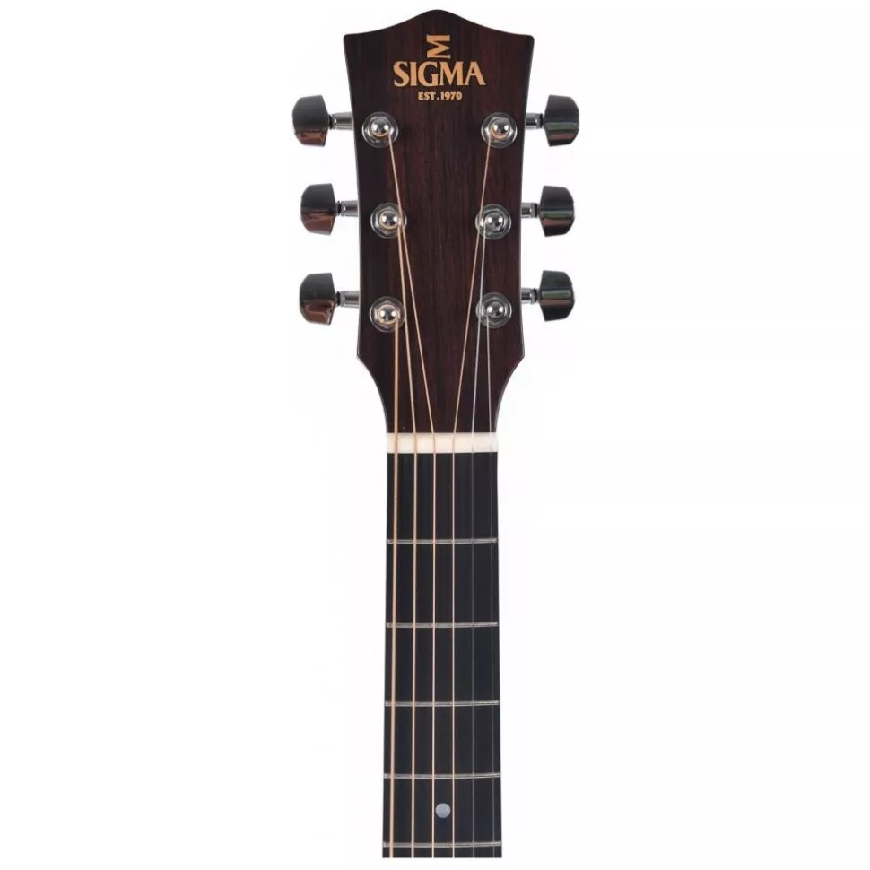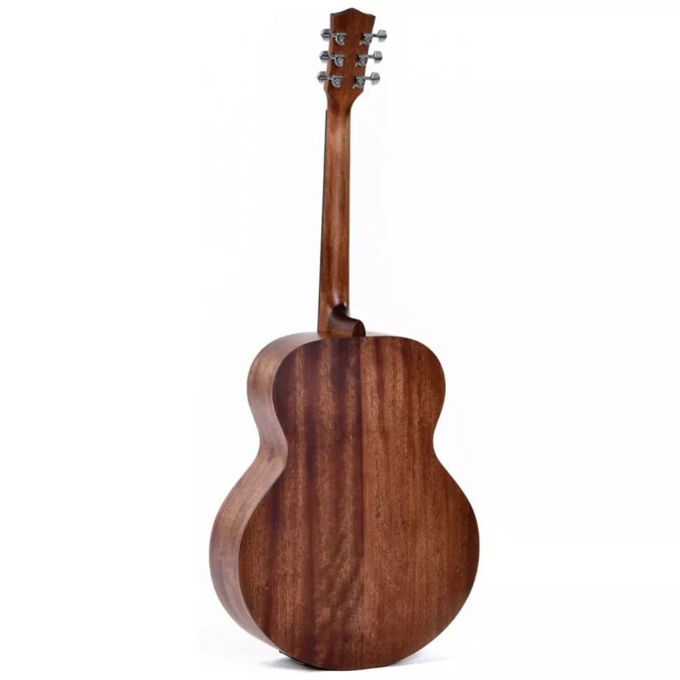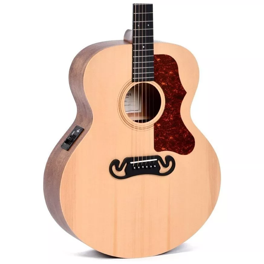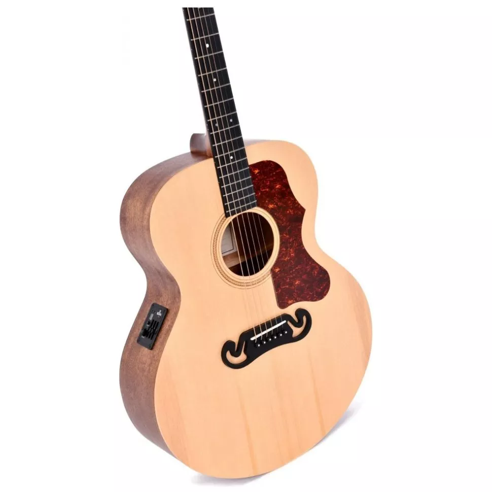Верхняя противня электроакустической гитары Sigma GJME производится из массива ситхинской ели. Такая древесина упругая, поэтому идеально резонирует на средних частотах, а также, создает мягкий характер звука. Дно и обечайка изготовлены из Mahogany (красное дерево), в сочетании с глубоким корпусом гранд джамбо создают выразительное звучание каждой ноты аккорда.